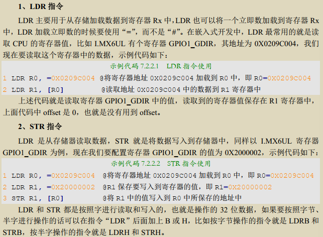 ARM 不能直接访问存储器,比如 RAM 中的数据, I.MX6UL 中的寄存器就是 RAM 类型的,我们用汇编来配置 I.MX6UL 寄存器的时候需要借助存储器访问指令,一般先将要配置的值写入到 Rx(x=0~12)寄存器中,然后借助存储器访问指令将 Rx 中的数据写入到 I.MX6UL 寄存器。读取 I.MX6UL 寄存器也是一样的,只是过程相反。常用的存储器访问指令有两种: LDR 和STR