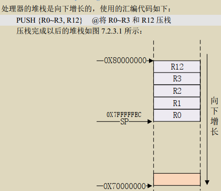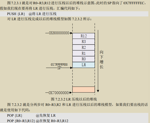我们通常会在 A 函数中调用 B 函数,当 B 函数执行完以后再回到 A 函数继续执行。要想在跳回 A 函数以后代码能够接着正常运行,那就必须在跳到 B 函数之前将当前处理器状态保存起来(就是保存 R0~R15 这些寄存器值),当 B 函数执行完成以后再用前面保存的寄存器值恢复R0~R15 即可。保存 R0~R15 寄存器的操作就叫做现场保护,恢复 R0~R15 寄存器的操作就叫做恢复现场。在进行现场保护的时候需要进行压栈(入栈)操作,恢复现场就要进行出栈操作。压栈的指令为 PUSH,出栈的指令为 POP, PUSH 和 POP 是一种多存储和多加载指令,即可以一次操作多个寄存器数据,他们利用当前的栈指针 SP 来生成地址