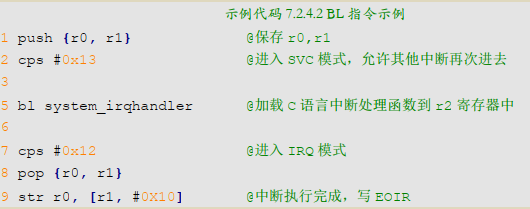 BL 指令相比 B 指令,在跳转之前会在寄存器 LR(R14)中保存当前 PC 寄存器值,所以可以通过将 LR 寄存器中的值重新加载到 PC 中来继续从跳转之前的代码处运行,这是子程序调用一个基本但常用的手段。比如 Cortex-A 处理器的 irq 中断服务函数都是汇编写的,主要用汇编来实现现场的保护和恢复、获取中断号等。但是具体的中断处理过程都是 C 函数,所以就会存在汇编中调用 C 函数的问题。而且当 C 语言版本的中断处理函数执行完成以后是需要返回到irq 汇编中断服务函数,因为还要处理其他的工作,一般是恢复现场。