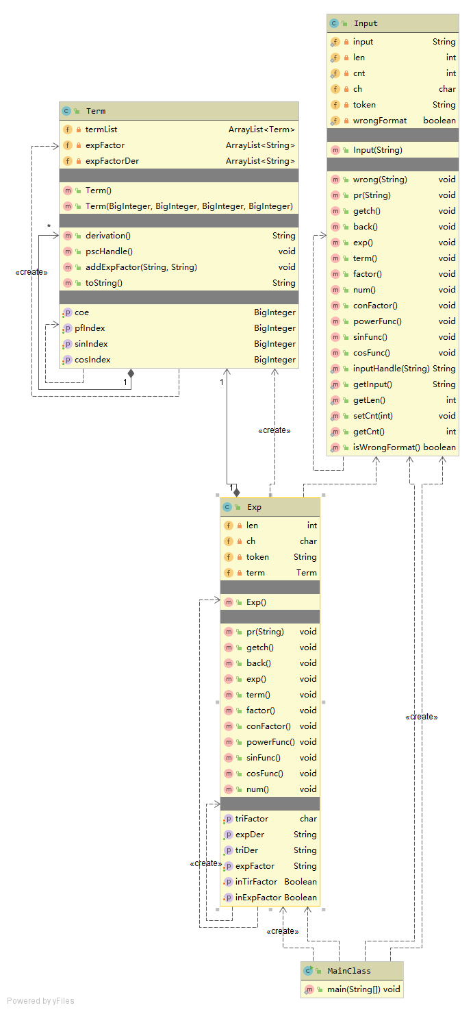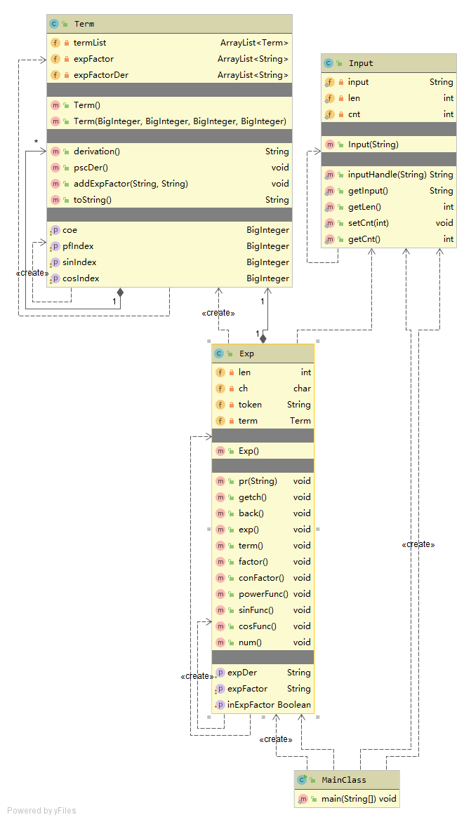 本次作业进行了重构,不在使用正则表达式,而是利用递归下降分析,逐个读取字符,识别出项。Term类包含常数系数,幂函数指数,正弦函数指数,余弦函数指数,表达式因子列表和表达式因子导数列表等属性。在遇到表达式因子时,将其字符串保存在项的表达式因子列表,将其导数保存在表达式因子导数列表。然后依据乘法法则构造项的导数,连接构成表达式的导数。