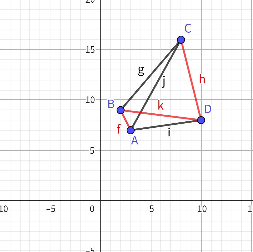这里我们先考虑 \(B,C,D\) 三个点,注意到 \(CD\) 的斜率比 \(BD\) 的斜率小,即 \(D\) 先于 \(C\) 相遇,后与 \(B\) 相遇。