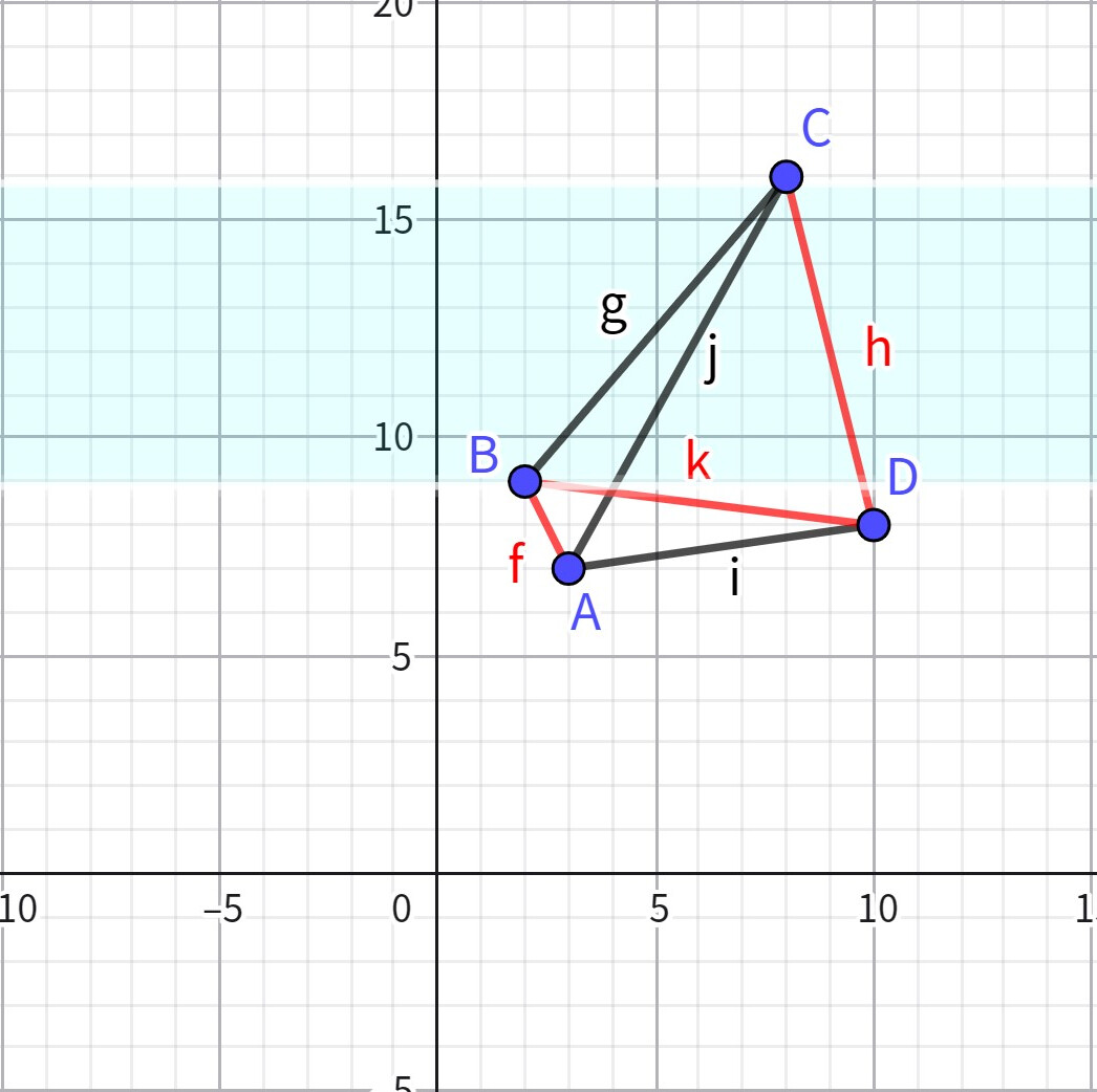 考虑关注一个点 \(k\) 的影响范围,容易想到点 \(k\) 的影响范围为 \(\left\{(x,y)\mid y\ge l,y\le r\right\}\) 其中 \(l\) 为最小的使与 \(k\) 连线的斜率小于 \(0\) 的点的纵坐标,类似的,\(r\) 为最大的使与 \(k\) 连线的斜率小于 \(0\) 的点的纵坐标,我们拿上图中的 \(D\) 点举例: