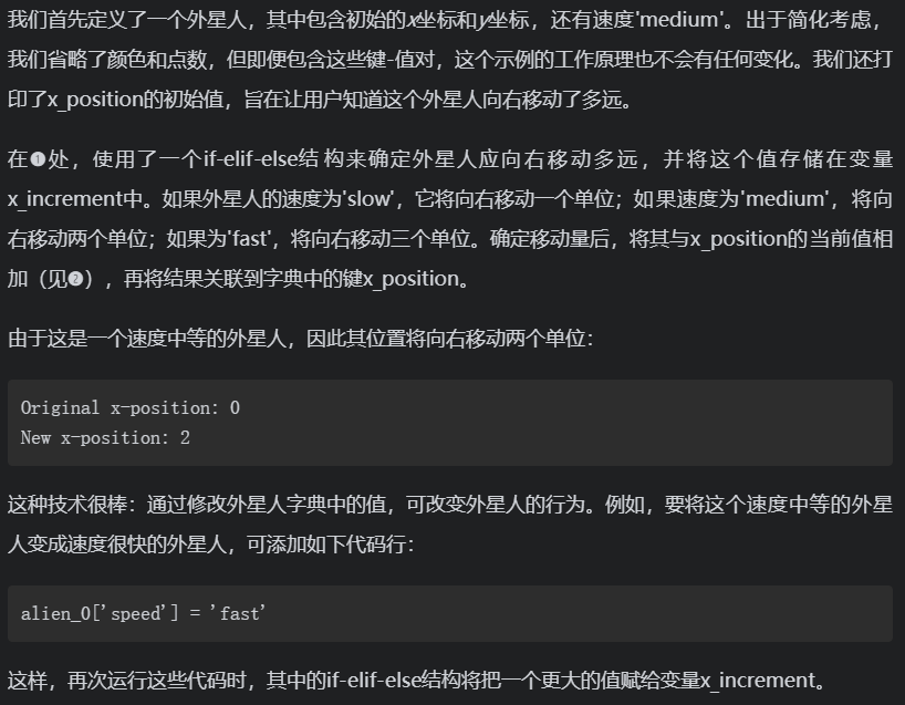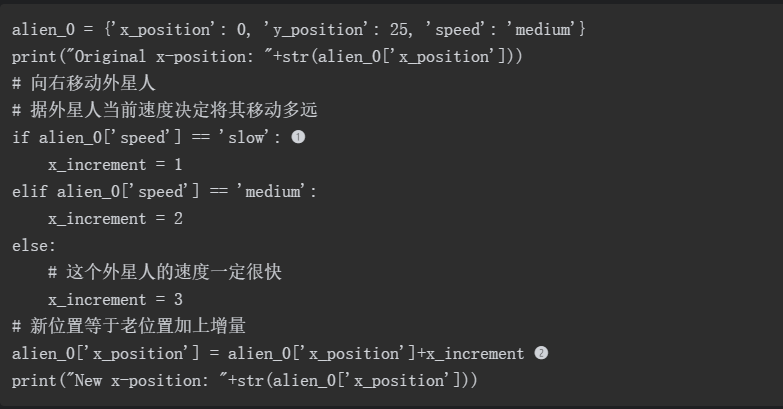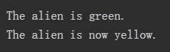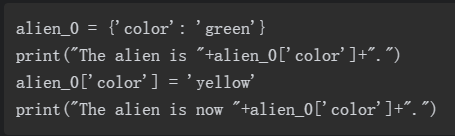 1、更新字典:假设需要将一个外星人从绿色改为黄色: