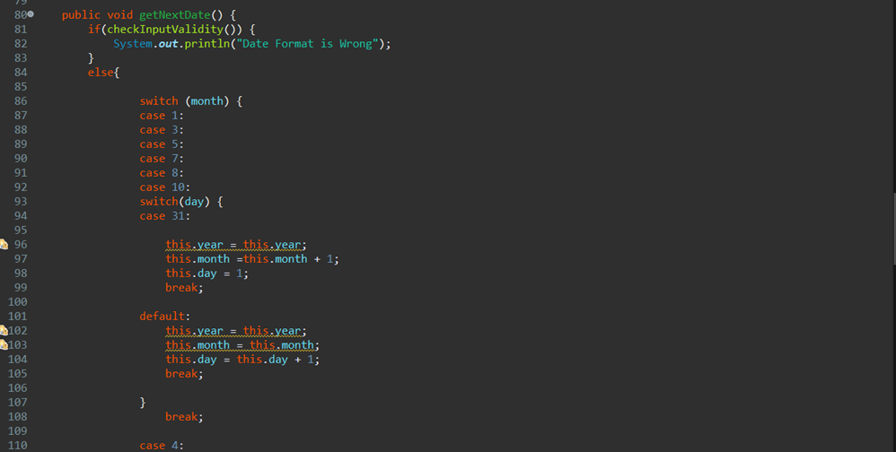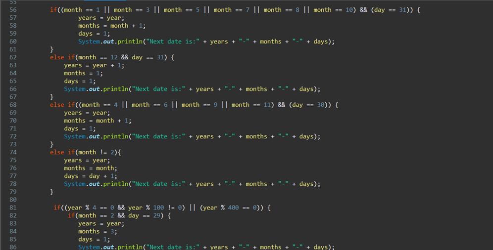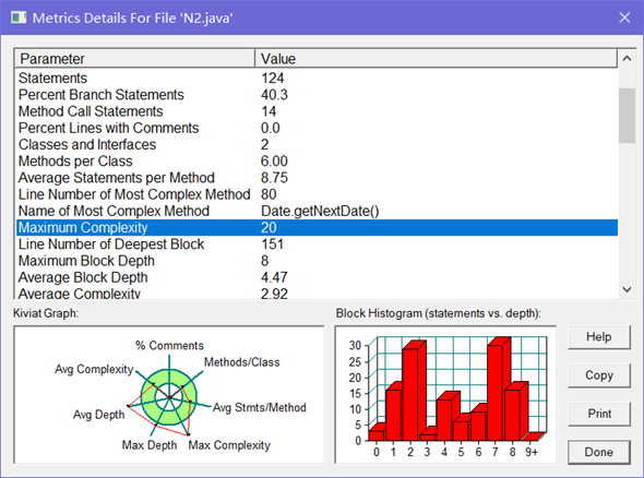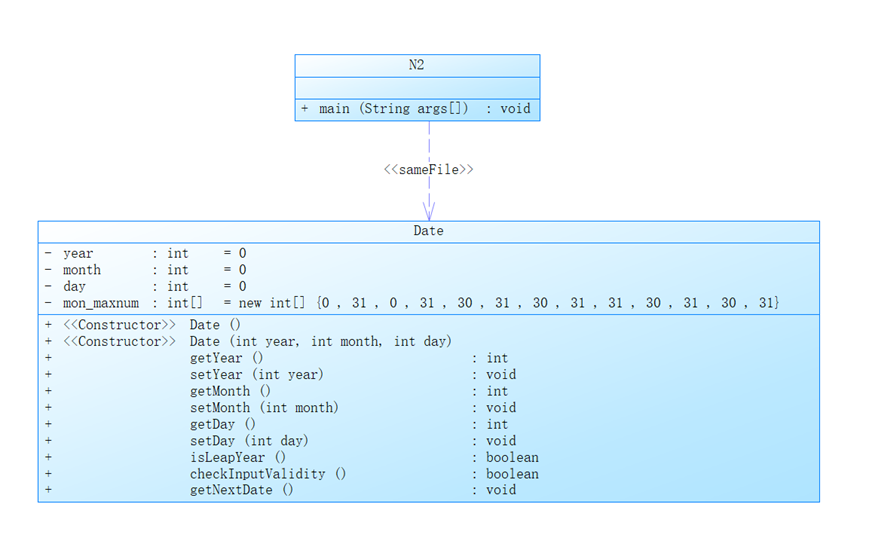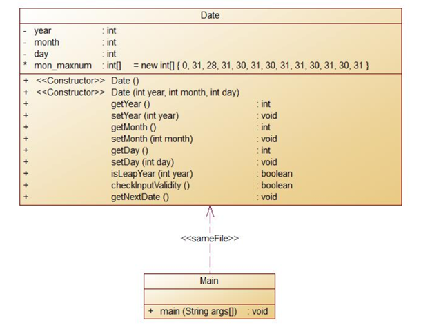 根据题目给出的类图创建相应的类和方法,再加上在题目集二中做过求下一天的题目,所以在算法上没有很大难度,最主要是要注意运用类与类的封装性,年月日和月的最大天数都是私有属性,在Date类中不能出现相关变量。这次刻意避免了用if-else来判断日期,使用了switch语句,但还是出现了复杂的嵌套,最高圈复杂度可能就是因为switch的嵌套,但平均圈复杂度没有像题目集二中那么高,现在只有2.92。这斌不是最终结果,后续我还会去优化switch的嵌套部分。最终做出来源码的类图和题目中的全部相同,除了月份最大天数,关于每月的最大天数,我将数组中对应的2月份天数初始化为0,到后面判断闰年的时根据具体概况重新对其进行赋值。