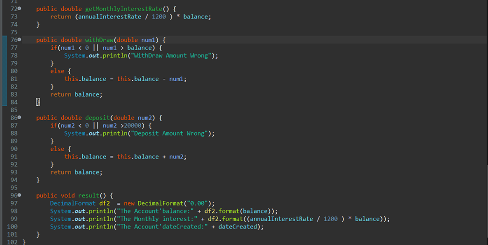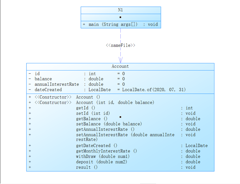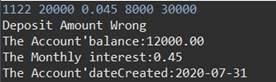 题目给了详细且明确的要求,根据要求去创建类和方法,明确需求后很快有了思路,虽然大部分代码为自动生成,但通过这道题我进一步理解了封装性的作用和好处。有一个小难点就是对于题目中要求的"账户开户时间,私有属性,LocalDate类型,默认为2020年7月31日",尝试了多种我已知的方法,但最终的输出结果都是"0-0-0"。通过多方查找资料,设置了"private LocalDate dateCreated = LocalDate.of(2020, 07, 31);"私有属性,在最后可以正确得出"The Account'dateCreated:2020-07-31"的结果。