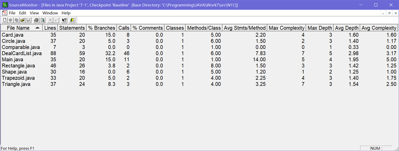 题目集七主要涉及继承、多态性使用方法,ArrayList泛型的应用方法和Comparable接口及泛型的应用。7-1在题目指导书中给出了类图和主方法源码,分析指导书中的需求并严格按照单一职责原则进行编程,最终得到的程序类图与参考类图一致。难点在于ArrayList泛型动态数组的使用,用于几何元素的存储、计算和排序,题目难度适中。7-2则是沿袭7-1,将最后得出的结果按照几何图形类型进行分组,对每组内的图形按照面积值降序排序并输出;求出每组内图形面积的总和;求出所有组的面积总和的最大值并输出。在7-1的基础上,在DealCardList类中增加对几何元素的分组方法和排序计算方法。按照指导书中的需求,一步一步分析,可很快得出最终结果,难度适中。