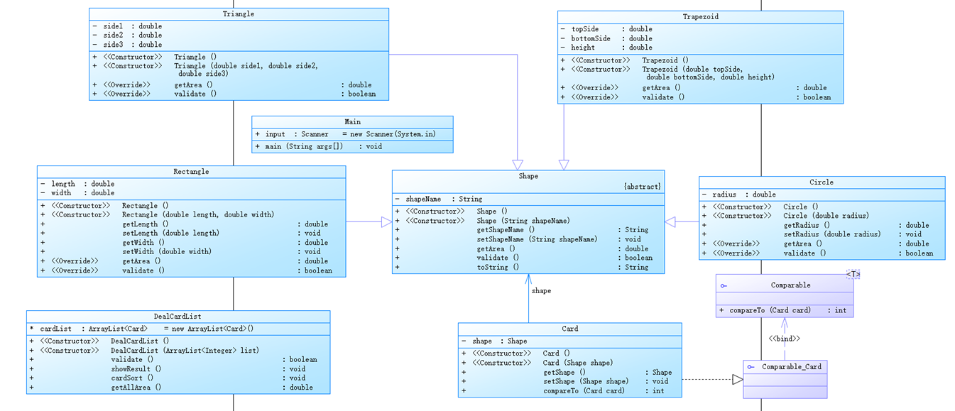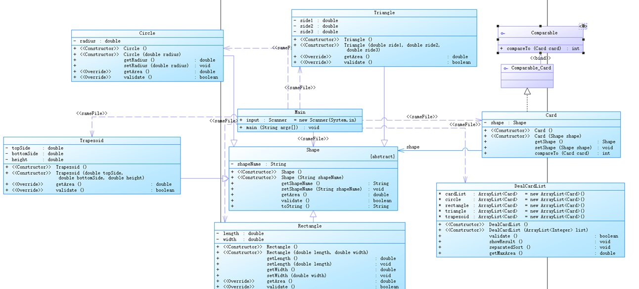 题目要求设计卡片大小排序游戏,求出各卡片的面积大小,然后将卡片按照其面积值从大到小进行排序,同时求出所有卡片的面积之和。根据指导书给出的类图,首先创建好Shape抽象类,写好相应的抽象方法,最后的ToString中写入输出格式。再将每一个几何图形实体类用Shape抽象类继承,写好相关几何图形的私有属性,根据几何图形的性质重写Shape抽象类中的getArea和validate方法。Card 类需要实现 Comparable 接口中的 CompareTo()方法,首先单独写一个Comparable接口类,用Card类来继承。在Card类中重写CompareTo方法,直接用对象进行排序,相比用for循环比较代码跟简洁方便。Main类题目中有源码直接使用,其中包含有输入检测的方法, ArrayList<Integer> list = new ArrayList<>();创建了图形种类代码的列表,用来存储代表几何图形种类的0-4整数。接着通过DealCardList dealCardList = new DealCardList(list);将输入的数字传入DealCardList类中,以便进行图形种类后续的数据输入判断。DealCardList类首先对Main类中传入的整数列表进行判断分类,同时创建Card列表来储存输入对象的相关数据。此处对于list列表中的数字判断运用Switch语句,以降低程序的圈复杂度。此时数据录入完毕,然后通过validate方法进行输入数据的检测,若数据有误,输出相应的语句;若数据无误,在cardSort方法中运用双循环对几何图形的面积进行比较排序:比较:cardList.get(i).compareTo(cardList.get(j + 1));排序:Collections.swap((List<Card>) cardList, i, j + 1)。最后,在getAllArea方法中,对所有的面积进行求和,获得allArea全部面积。在showResult方法中,根据指导书中给出的测试结果进行排版,使格式与需求相同。运用测试数据进行测试,数值结果与格式均无误。通过PowerDesigner得出的类图与指导书中的类图基本一致。由于严格按照单一职责原则编程,圈复杂度较低。