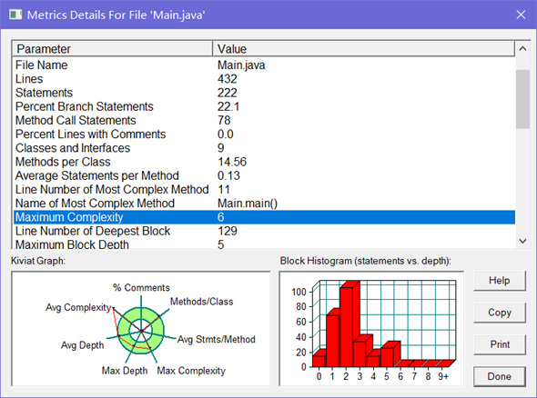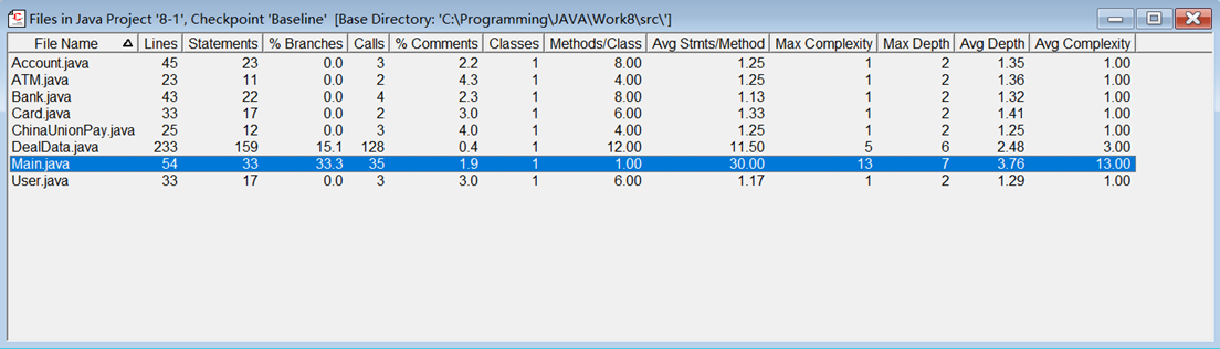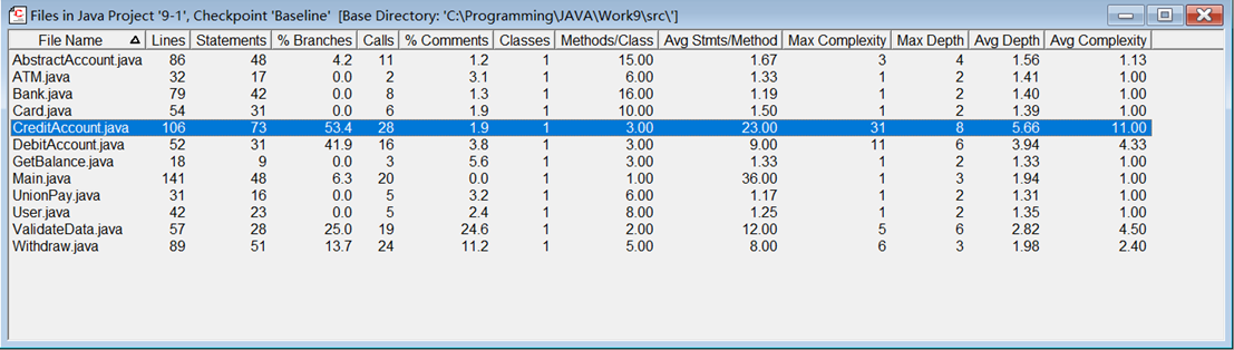 (2)关于代码的圈复杂度,在7-1和7-2中,保持的相对较好,最大复杂度都在10以下。但在8-1和9-1中,有个别类的复杂度一度超过了10,原因还是算法不够精简。例如8-1中的Main类,在判断输入账户数据信息是否存在或正确的方法中,几乎都是if-else语句进行判断,而且有多重嵌套重复,导致复杂度升高。9-1也是如此,两个账户子类中关于跨行和余额的判断用到了大量的if-else语句嵌套很是复杂度很高。后期尽量要减少此类情况的使用,想办法用更精简的方法去提高代码质量。