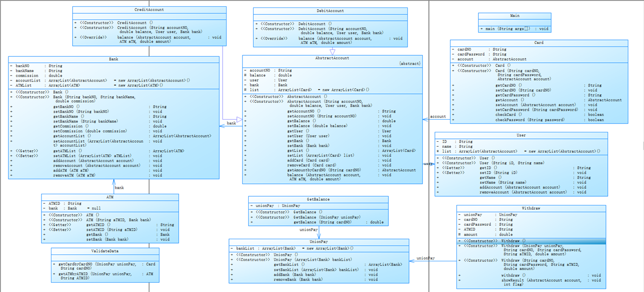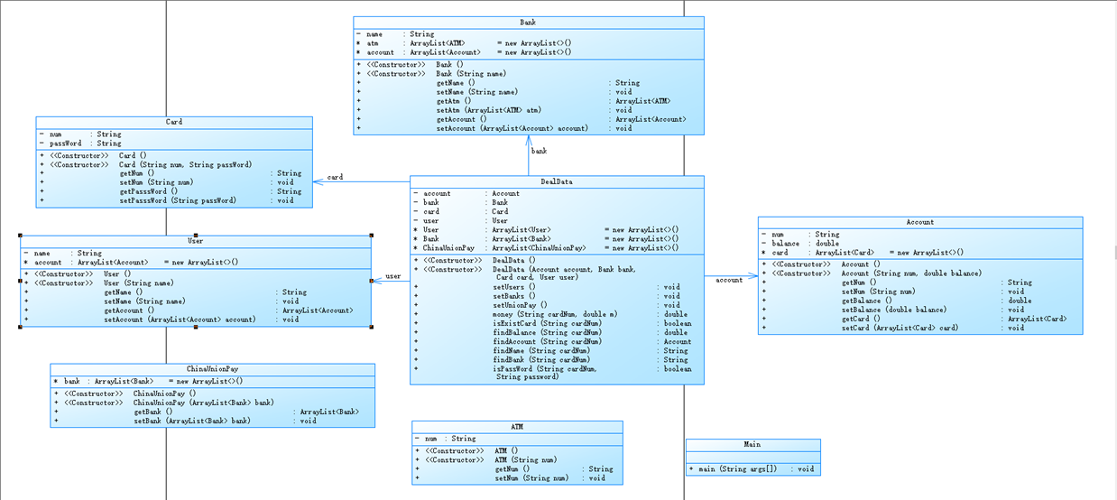 至此,所有实体类的关系已经梳理清楚,开始写实体类:在ChinaUnionPay类中写ArrayList<Bank> bank = new ArrayList<>();ATM类中写其私有属性机器编号;Bank类中写ArrayList<ATM> atm = new ArrayList<>(); ArrayList<Account> account = new ArrayList<>();和私有属性银行名称;Account类中写ArrayList<Card> card = new ArrayList<>();和其私有属性银行账号和余额;User类中写ArrayList<Account> account = new ArrayList<>();和私有属性用户姓名;Card类中写其私有属性卡号、密码。实体类创建完毕。
