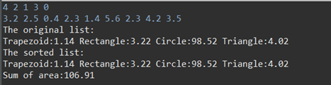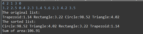 将每个几何图形创建一个列表动态数组以储存相同几何图形的数据,同时将图形按类别分组。输入时同时将图形数据存入cardlist列表和相应图形列表中。进行排序时,同7-1运用compareTo按照图形类别在组中进行比较,按照相应的格式进行输出。在showResult方法中, "The original list"直接运用cardlist列表进行输出;"The Separated List"按照指导书给出的顺序,用相应的列表逐个类别输出;"The Separated sorted List"则可用separatedSort();方法进行输出。最后获取每组中最大面积和,使用了数组比较,将每组获得的面积之和存入数组中,然后通过for循环比较,得出最大面积和,直接输出。最后,上数据进行多次验证测试,需求全部得以实现。