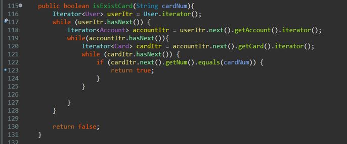 在主方法中,对于输入的信息作为字符串储存,用while循环入口为判断输入是否为结束符号"#",进入while循环后,将字符串根据空格拆分成若干字符串数组,此处用到了正则表达式的匹配:String[] index = line.split(" +");,根据字符串数组的每一部分,做输入错误处理、结果计算和输出内容格式化。其中输入错误处理在DealDate类中用迭代器进行列表遍历,遍历整个列表查找是否存在银行账号,银行账户的余额,卡号、密码或存取款ATM机是否与开户银行相同,以达到纠错的作用,提示相关信息。迭代器提供一个统一的方法遍历对象,不用再考虑聚合的类型,使用一种方法就可以遍历对象。用到迭代器的有isExistCard、findBalance、findAccount、findName、findBank、isPassWord。不过每个聚合对象都要一个迭代器,会生成多个迭代器不好管理类。最后,在DealDate类中写了一个money方法进行余额的计算,m为要存款或取款的金额,由于存款输入数值为-xxx.xx,取款输入数值为+xxx.xx,所以可用一个公式a = findBalance(cardNum) - m;来表示存取款后余额的计算。