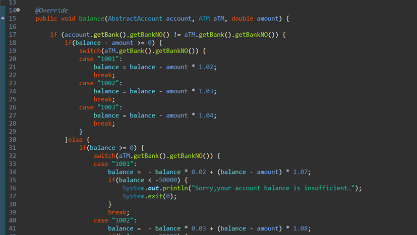 由于贷记账户和借记账户有不同的业务功能但又有多种相同属性,将原有的Account类作为AbstractAccount抽象类,让CreditAccount类和DebitAccount类继承,实现多态,提高了代码的拓展性和维护性。抽象类中加入balance抽象方法,让其他两个子类根据各自属性进行重写。重写balance方法中包括有跨行判断和余额判断,根据跨行行为和取款金额分多种情况动态计算余额。