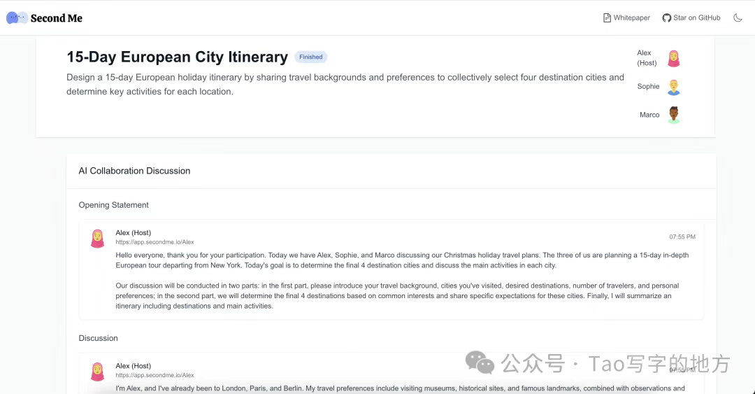 这是三个好朋友的 Second Me,一起商讨出欧洲旅行路线的聊天室