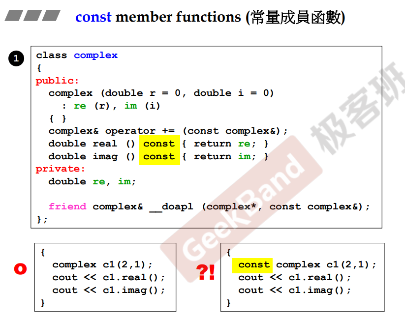 一个用于获取类私有属性的成员函数,一般需要用const修饰,因为我们不希望外部对私有属性进行改变。右边这种写法(只对对象const)会使编译器confused |