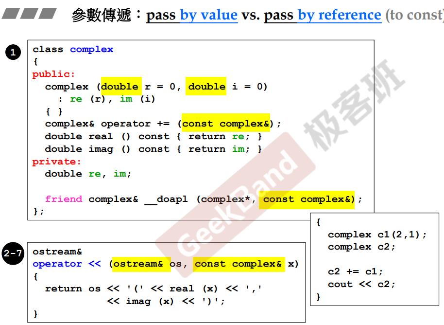 | 参数传递时,大部分情况,pass by reference好于pass by value。(开销小) 但往往需要使用const修饰引用。 |