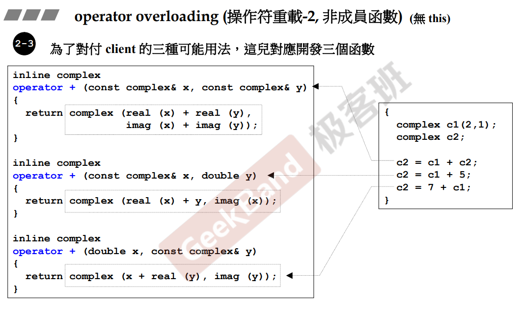 why非成员函数?如果为成员函数,无法实现第三种double + complex的情况。(因为this是complex) |