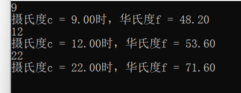 printf("摄氏度c = %.2f时,华氏度f = %.2f\n",c,f);