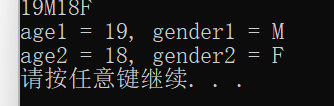 printf("age1 = %d, gender1 = %c\n", age1, gender1);
