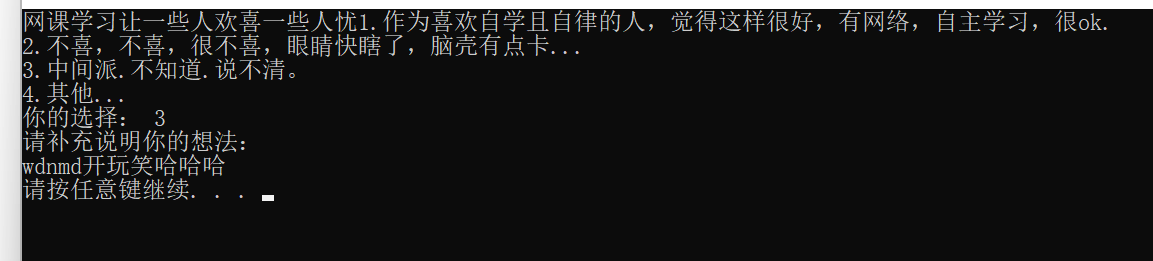 printf("2.不喜,不喜,很不喜,眼睛快瞎了,脑壳有点卡...\n");