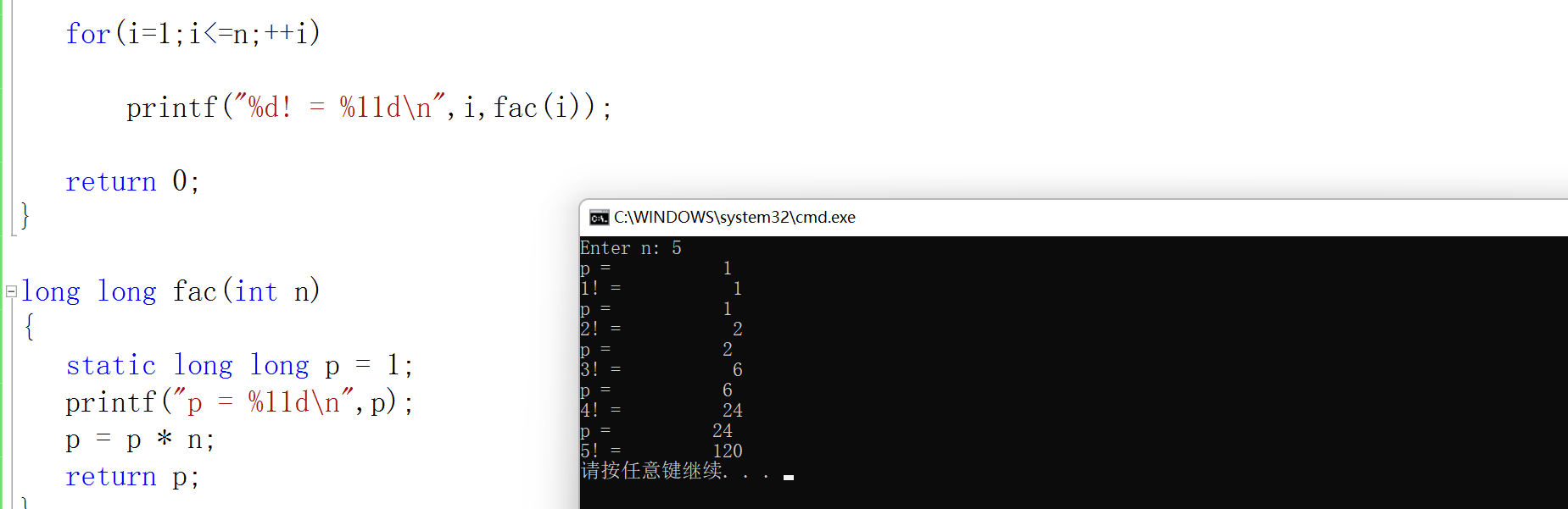 #include <stdio.h> long long fac(int n); int main() { int i, n; printf("Enter n: "); scanf("%d",&n); for(i=1;i<=n;++i) printf("%d! = %11d\n",i,fac(i)); return 0; } long long fac(int n) { static long long p = 1; p = p * n; return p;