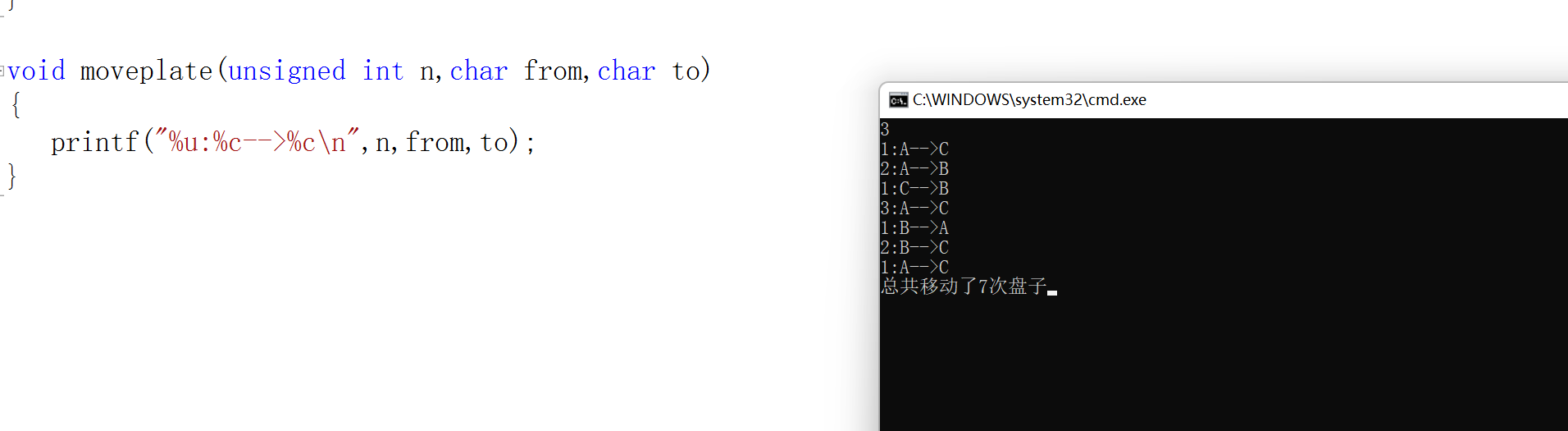 #include<stdio.h> void hanoi(unsigned int n,char from,char temp,char to); void moveplate(unsigned int n,char from,char to); int i=0; int main() { unsigned int n; while(scanf("%u",&n) != EOF) { hanoi(n,'A','B','C'); printf("总共移动了%d次盘子",i); } return 0; } void hanoi(unsigned int n,char from,char temp,char to) { if(n==1) { moveplate(n,from,to); } else { hanoi(n-1,from,to,temp); moveplate(n,from,to); hanoi(n-1,temp,from,to); } i++; } void moveplate(unsigned int n,char from,char to) { printf("%u:%c-->%c\n",n,from,to); }