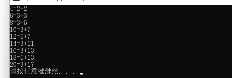 int main() { int n,a; for(n=4;n<=20;n+=2) { for(a=2;a<=n/2;a++) { if(is_prime(a) == 1 && is_prime(n-a) == 1) { printf("%d=%d+%d\n",n,a,n-a); break; } } } return 0; } int is_prime(int a) { if(a==2) return 1; else { int i=0; for(i=2;i<=(sqrt(a*1.0)+1);i++) { if(a%i==0) return 0; } } return 1; }