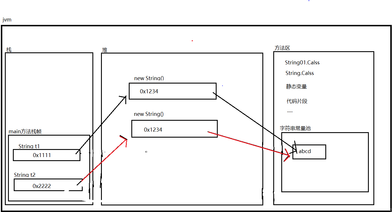System.out.println(t1==t2);//false 如内存图所示,t1与t2保存的两个不同的堆内存中的字符串对象地址