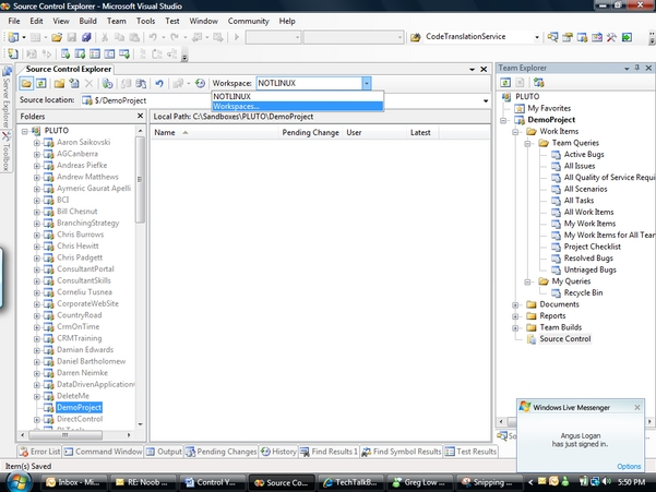 在文件上进行工作的程序猿,他们是逻辑的进出工作区。为了建立一个工作区,程序猿须要双击Team Explorer中的源代码控制图标,到工作区下拉菜单。