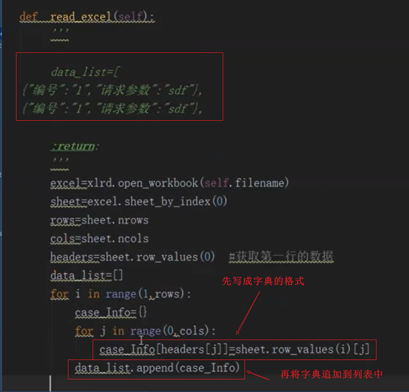 2.读取excel,先将第一行的内容获取出来,然后循环行数,之后循环列数,先将第一行的内容于下面的内容组装成字典,然后将字典追加到列表