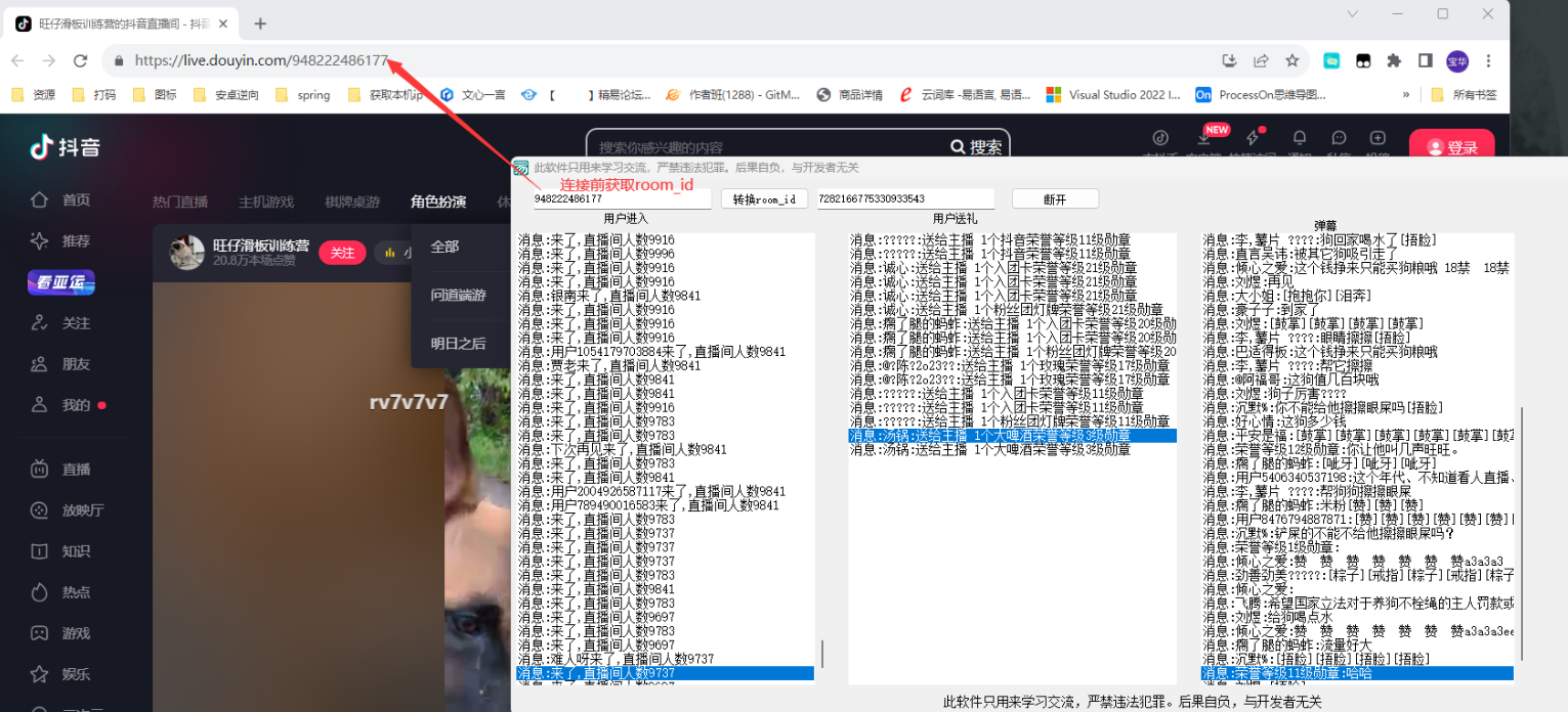 抖音弹幕wss协议获取进出房间,礼物,点赞,弹幕,仅供学习