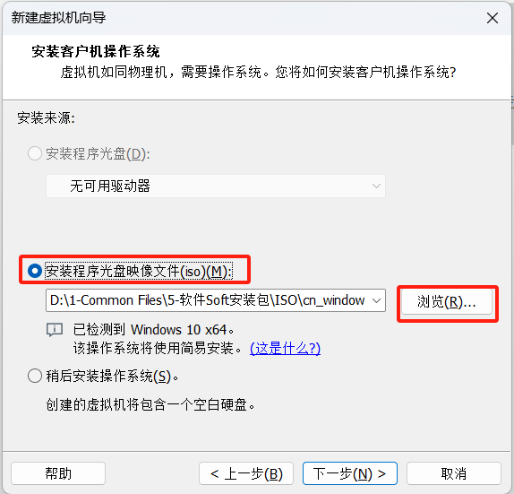 3)安装程序关盘映像文件(如果系统镜像已经下载好),如果没有下载好ISO镜像,可以选择 稍后安装操作系统(S)选项,之后加载进ISO系统也是可以的;这里已提前下载,浏览镜像文件,点击下一步
