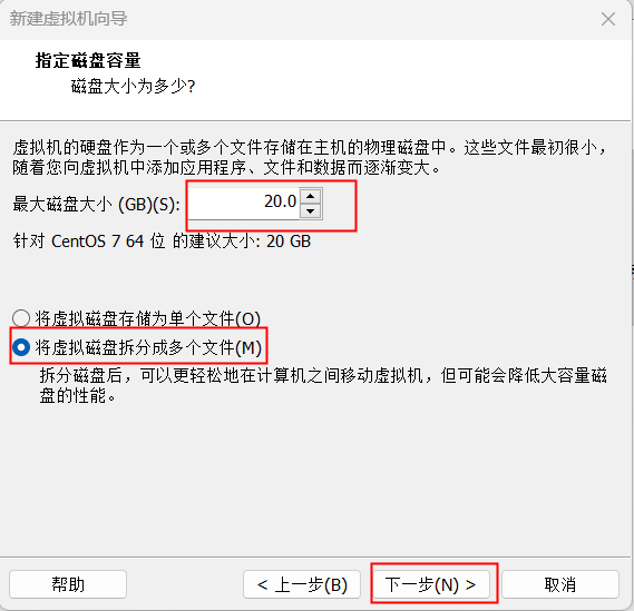 6)指定磁盘大小,推荐20G,选择磁盘拆分多个文件,点击下一步