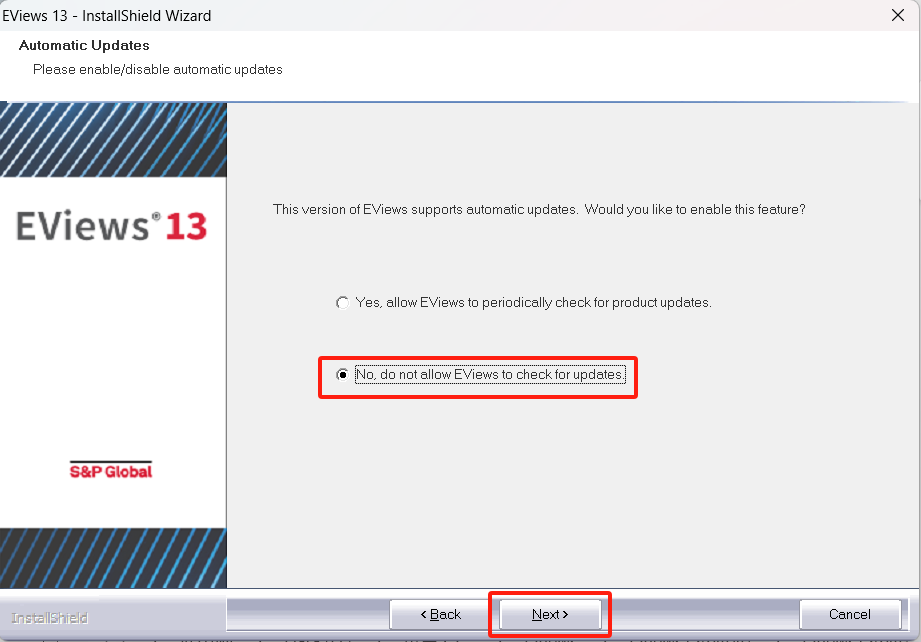 - 选择不自动更新,点击Next