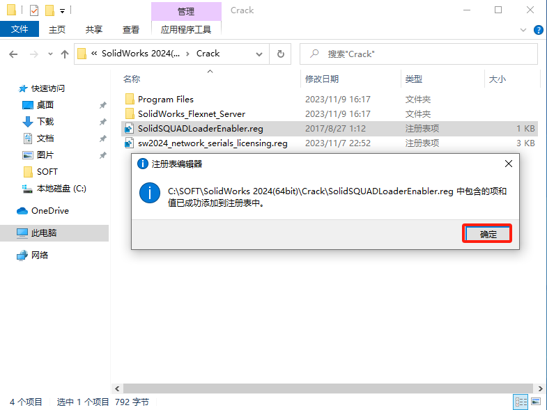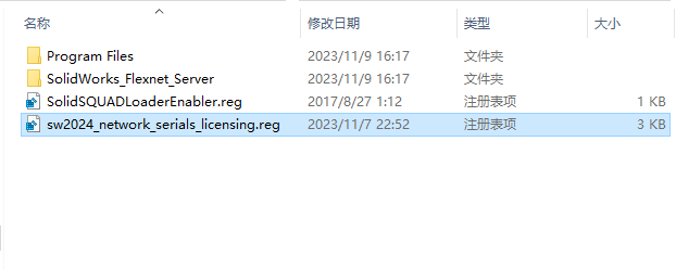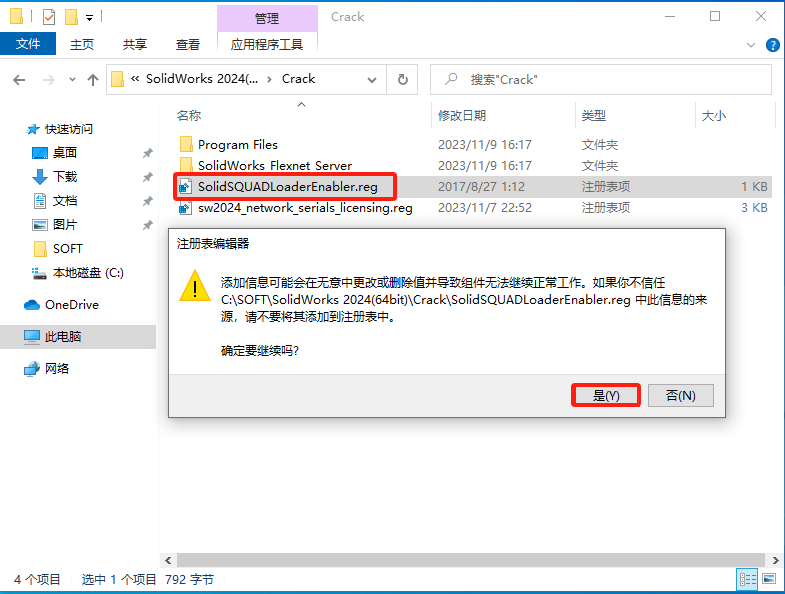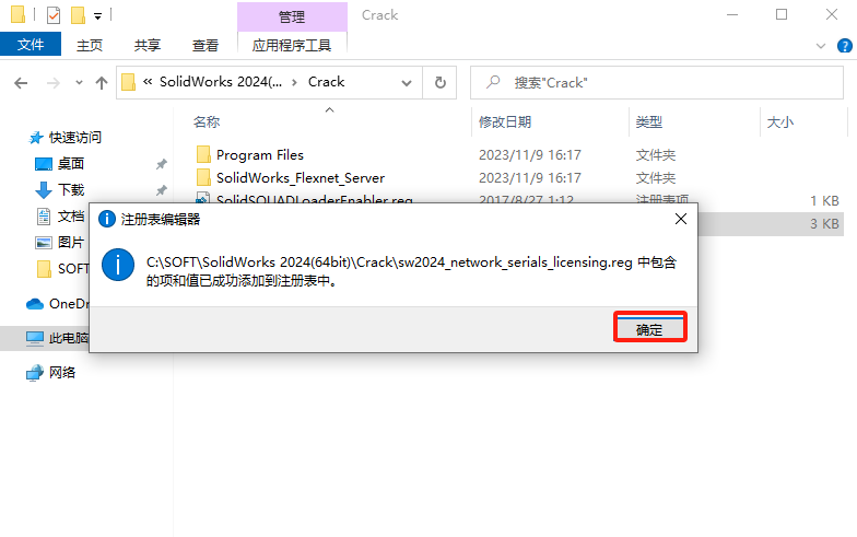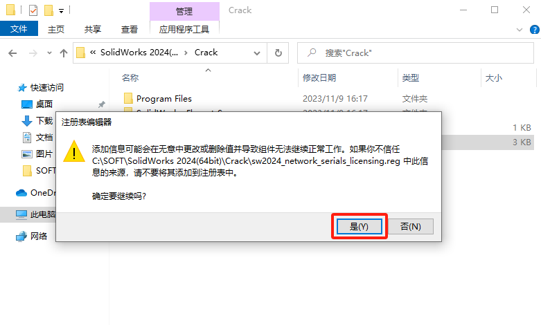 - 下载并解压下载的安装包,打开Crack文件夹,双击‘sw2024_network_serials_licensing.reg’添加注册表