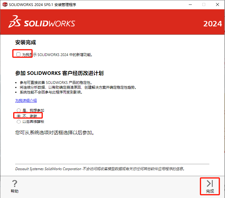 - 安装完成,取消勾选显示新增功能,以及不参加改进计划,点击完成