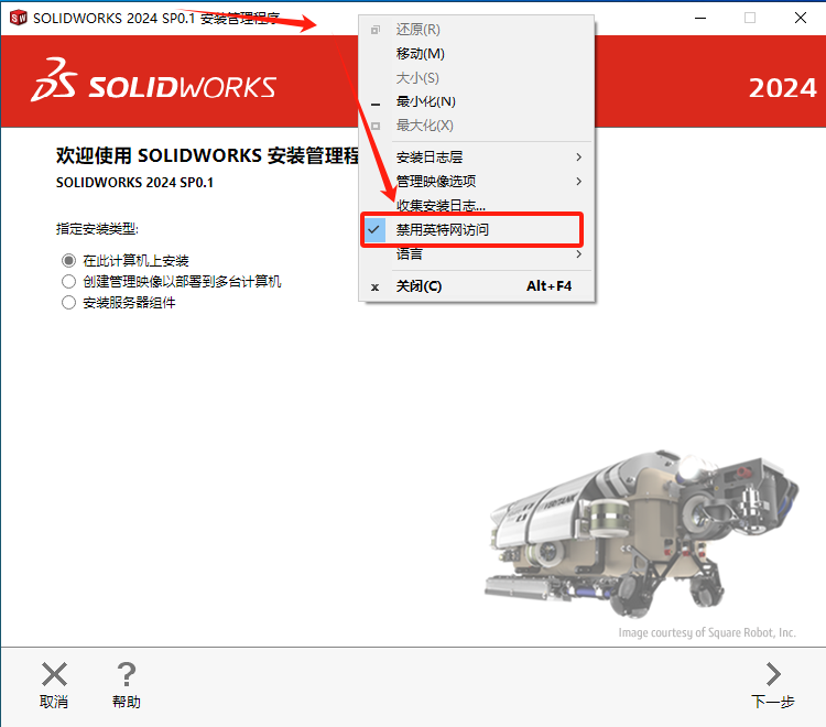 - 右击最上方窗口-禁用英特网访问,点击下一步