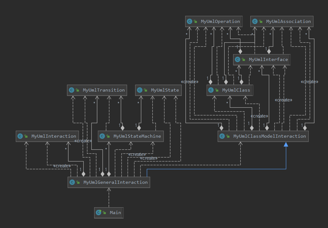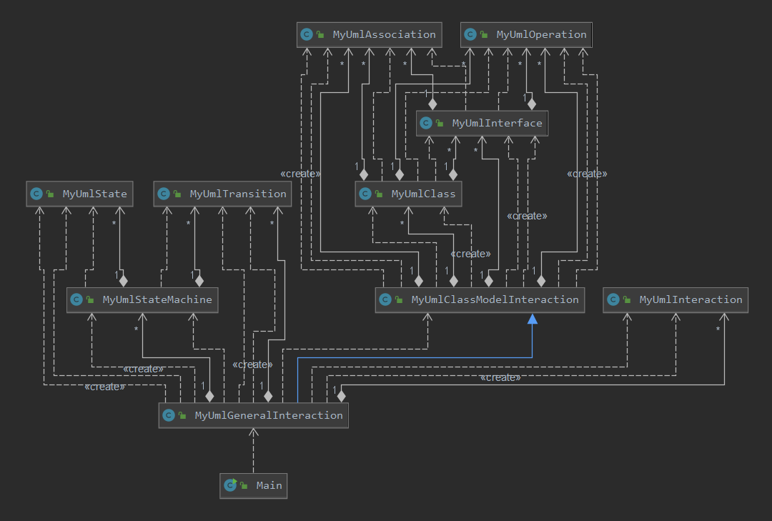 第十四次作业在架构上基本沿用了上一次作业,将原先MyInteraction类改为MyUmlClassModelInteraction,并在MyUmlGeneralInteraction类中继承这个类,实现对类图的处理,而在MyUmlGeneralInteraction类中实现对顺序图和状态图的处理。对UmlInteraction、UmlStateMachine、UmlTransition、UmlState进行了重新封装,根据需要实现的查询功能实现了一些新的方法。