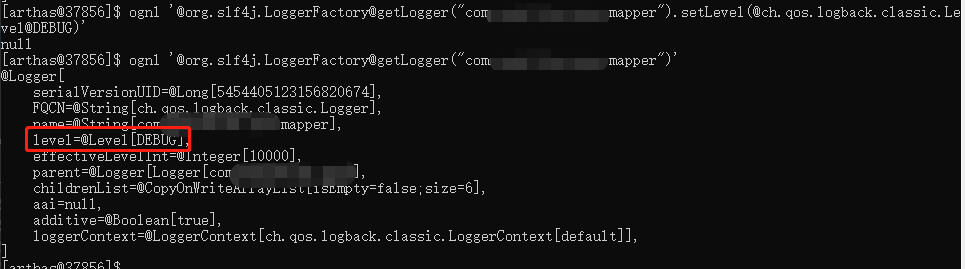日志级别改为DEBUG:ognl '@org.slf4j.LoggerFactory@getLogger("com.ruhuanxingyun.mapper").setLevel(@ch.qos.logback.classic.Level@DEBUG)'