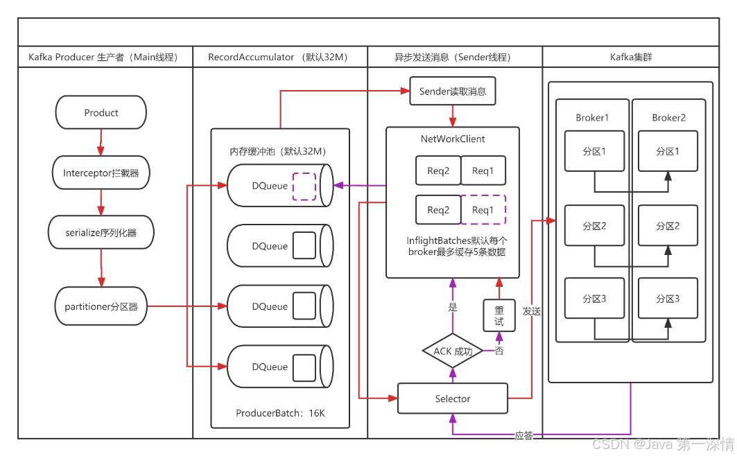 B. 消息发送方式:注意发送消息是main线程,但真正发送消息到kafka是sender线程;
