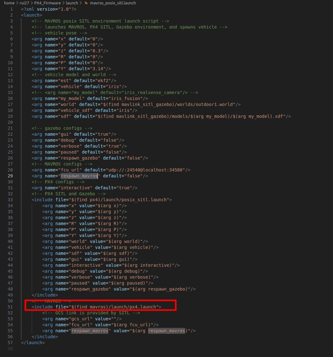 打开该文件,我们发现他调用了mavros/launch/px4.launch文件来启动仿真无人机,如下图所示。