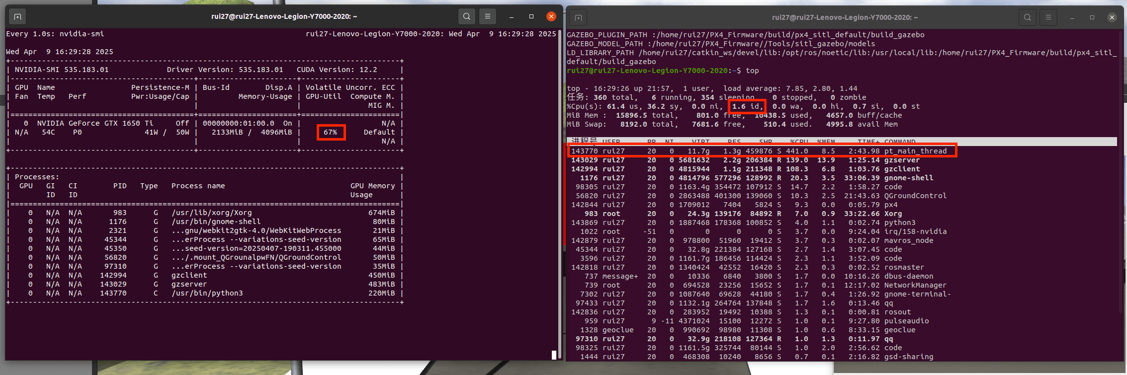 图中左边的67%表示GPU占用率67%,右边的1.6id表示CPU空闲率仅有1.6%,下方显示python线程占据了大量的CPU运算空间。