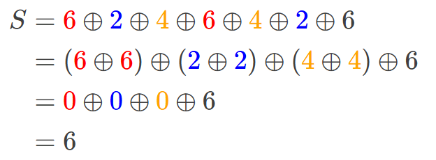设题目中的数列为 \(a\)。设 \(S=a_1\oplus a_2\oplus\cdots\oplus a_n\),即 \(S\) 为所有元素的异或和。由以上性质,将出现偶数次的相等的数两两配对,它们的异或和为 \(0\);将出现奇数次的数两两配对,除了若干对数的异或和为 \(0\) 以外,还会剩余一个数,因此它们的异或和为这个数本身。因此,\(S\) 的值为出现奇数次的这个数,即为答案。