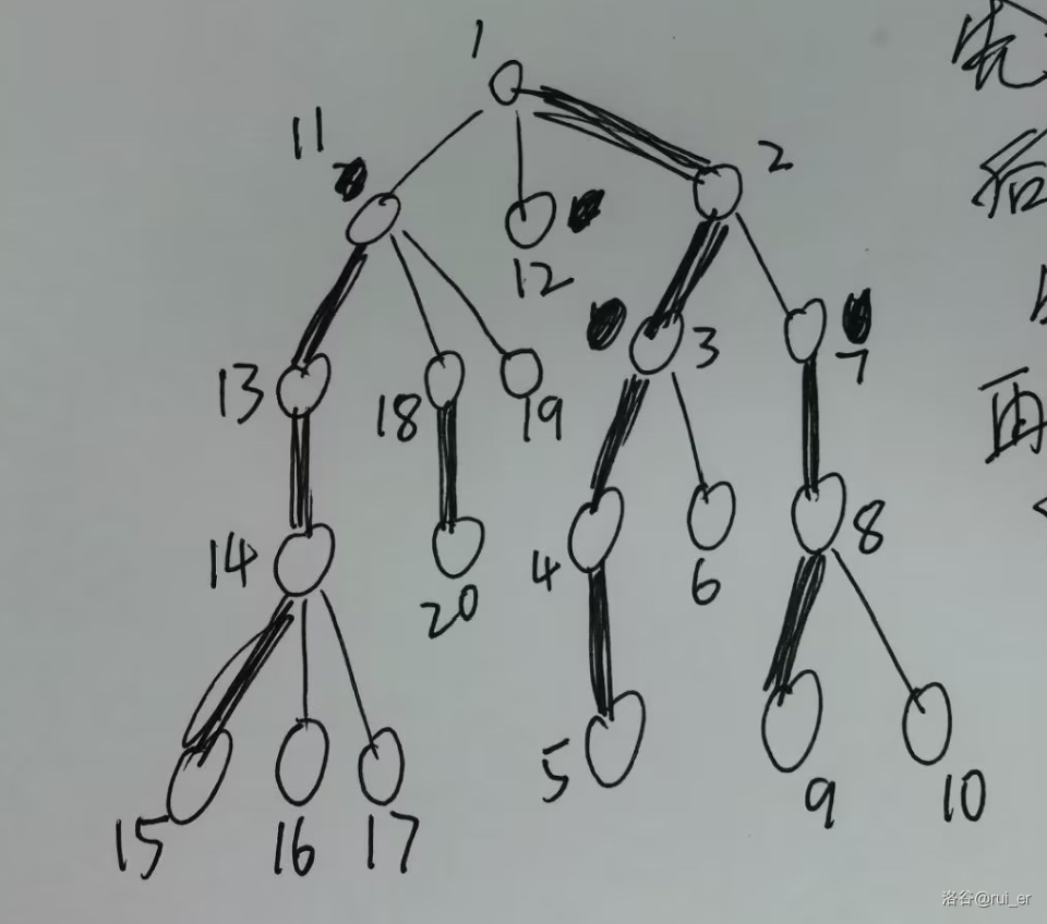 其中 \(11\sim 15\)、\(18\sim 20\) 的顺序跟正常树剖不一样,因为 \(1\) 递归重链子树内编号了 \(1\sim 10\),然后轻儿子编号为 \(11\sim 12\),再从 \(11\) 继续递归重链。