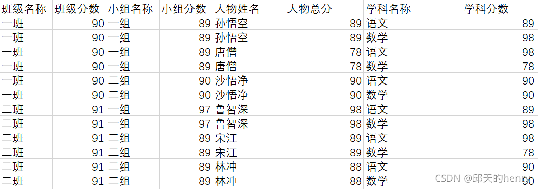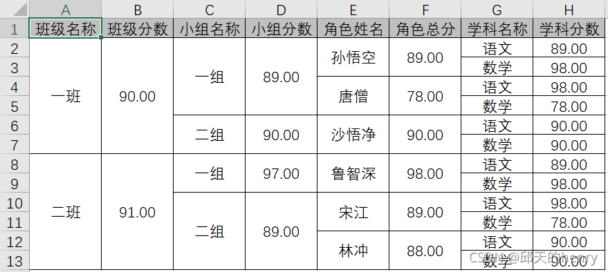 按照班级名称、班级分数、小组名称、小组得分、人物名称、人物总分进行单元格合并
