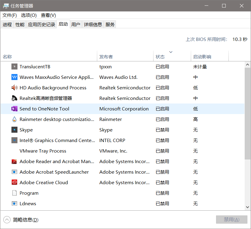 win10用户点击任务管理器中的详细信息后再点击启动在这个页面中关闭不必要的开机启动项 如下图所示