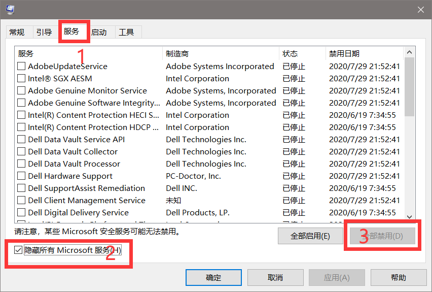 如图所示点击服务-隐藏所有Microsoft服务然后全部禁用点击确定 win7用户在这个软件中点击启动设置开机启动项