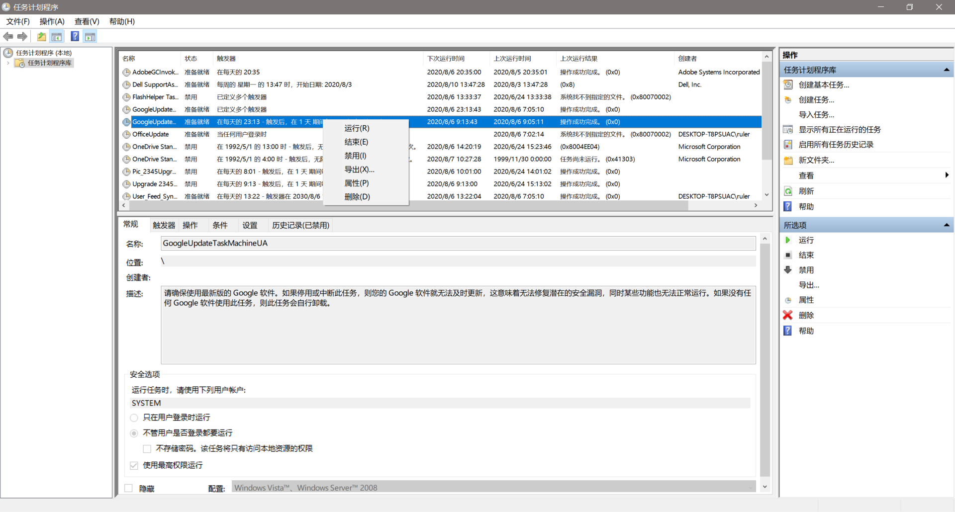 然后我们再次用任务管理器点击文件-运行输入taskschd.msc打开任务计划程序禁用任务计划程序定期运行的程序和开机启动的程序 如下图