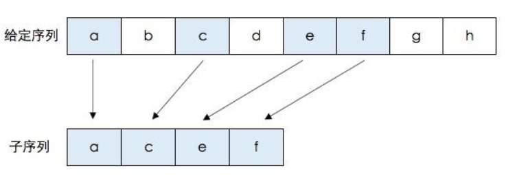 子序列:即一个给定的序列的子序列,就是将给定序列中零个或多个元素去掉之后得到的结果。