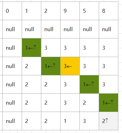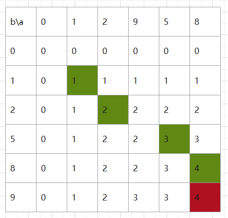 对于 a 的前 i 个元素和 b 的前 j 个元素, t [i] [j]是公共子序列的最大长度。设公共子序列中的最后一个元素是zx