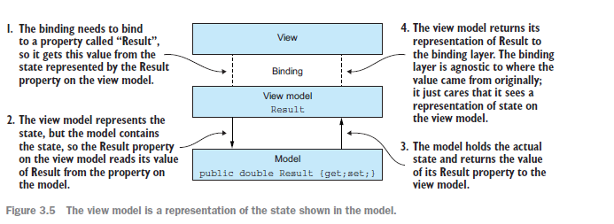 Binding is the glue that connects the view model to the view,and the view model will need to implement features such as property changed notifications that allow the binding layer to be aware of chagnes to